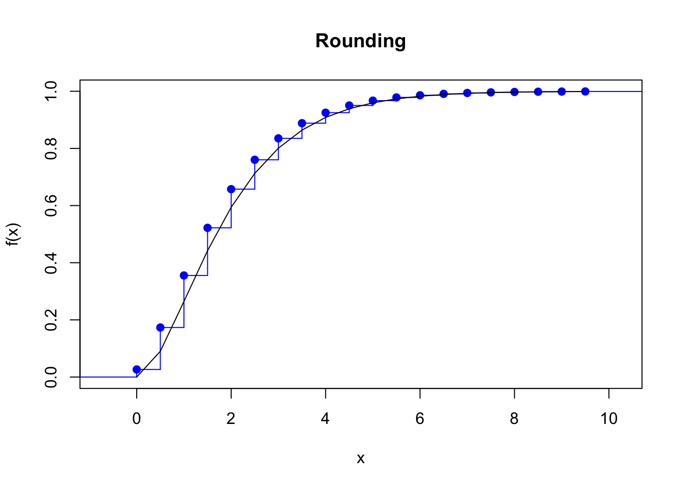 \end{align*}\] The true cdf passes exactly midway through the steps of the discretized cdf.