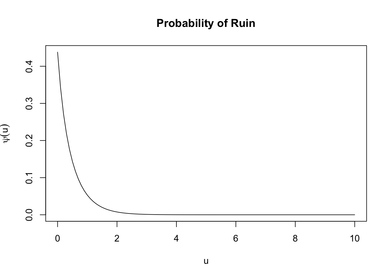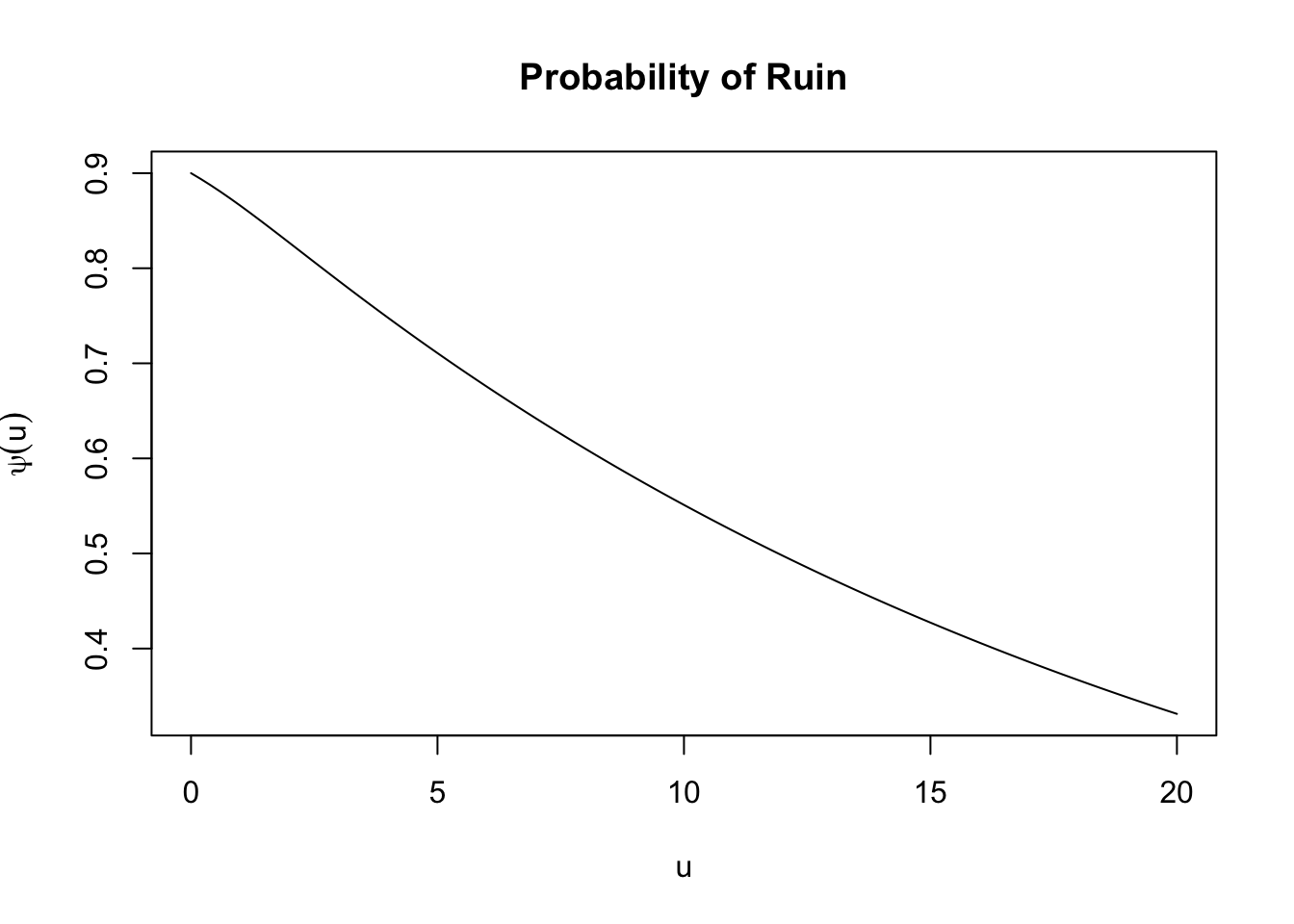 Moreover, we can plot the ruin probability straightforwardly as a function of the initial surplus using the plot() function as follows:
