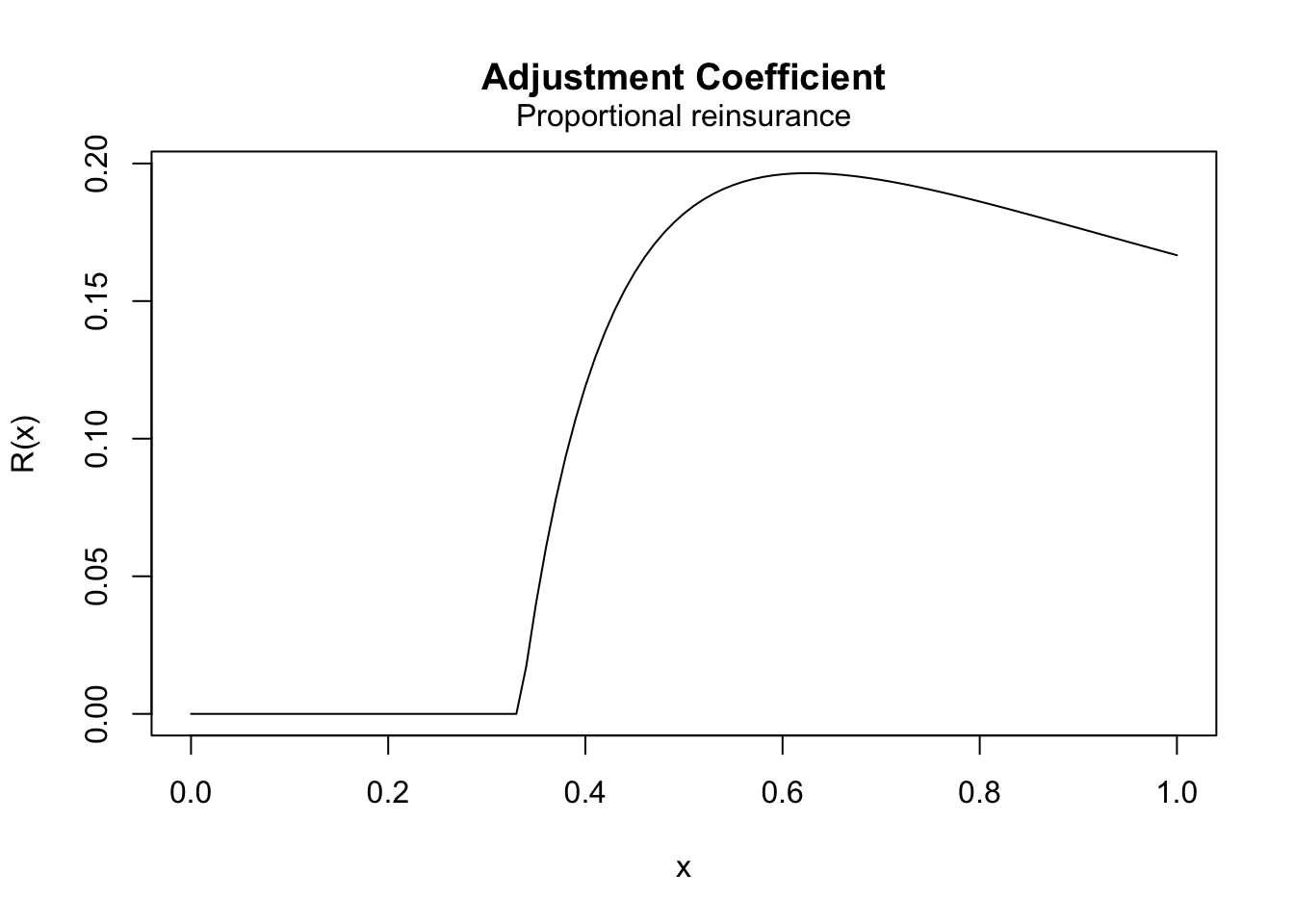 lambda <-2theta <-0.2thetah <-0.3# We require a function to compute the premium rate for different values of aprem <-function(x) { ((1+ theta) - (1+ thetah) * (1- x)) * lambda}# We require need a function to computute the mgf of aX for different values of amgf_ax <-function(x, y) {mgfexp(x * y)}adj_prop <-adjCoef(mgf_ax,mgf.wait =mgfexp(x, 2),premium.rate = prem,upper =1,reins ="prop", from =0, to =1)adj_prop(c(0.75, 0.8, 0.9, 1))