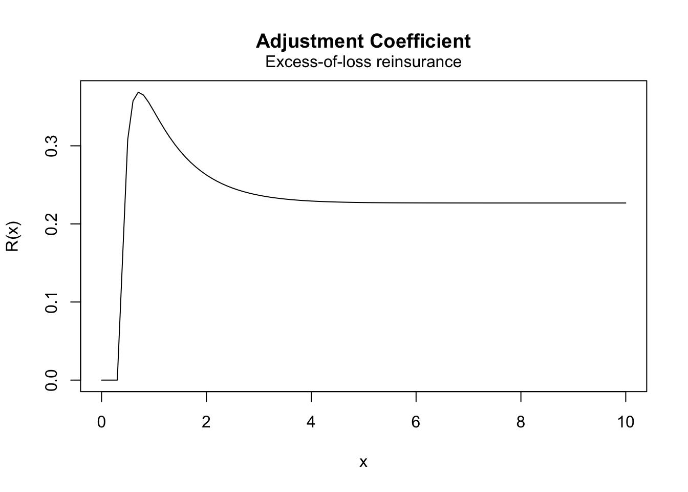 Example 4.3 Consider the following classical risk model under excess-of-loss reinsurance: The claim amounts are Gamma distributed with shape parameter \(2\) and rate parameter \(2\), the Poisson rate is \(\lambda=1\), and the safety loadings are \(\theta=0.2\) and \(\theta_h=0.3\). Plot the adjustment coefficient as a function of the retention limit \(m\) varying from \(0\) to \(10\).