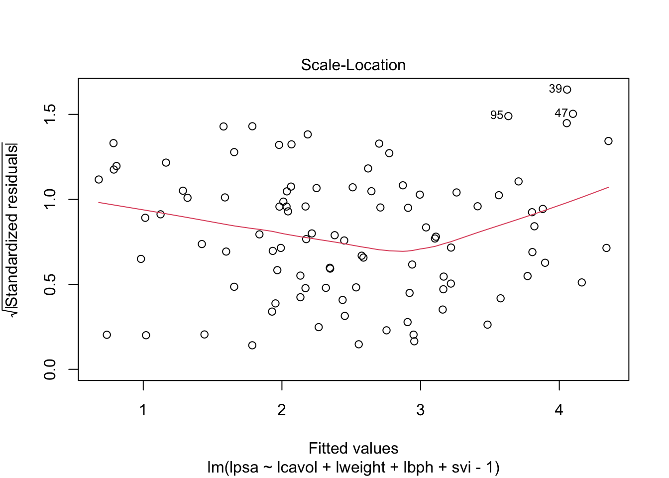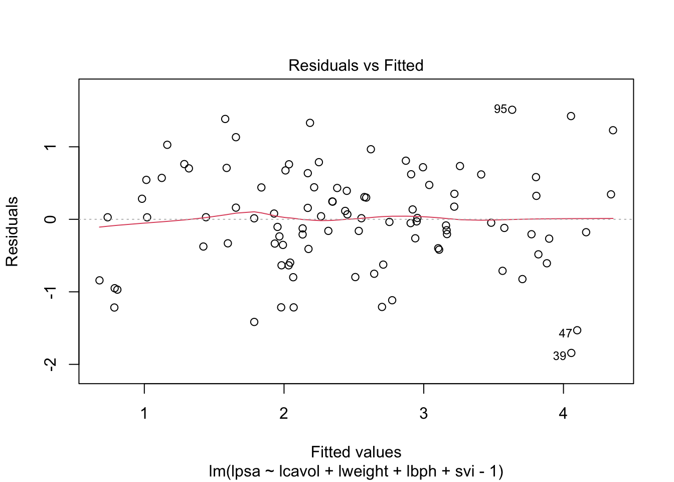 lm(formula = lpsa ~ lcavol + lweight + lbph + svi - 1, data = prostate)