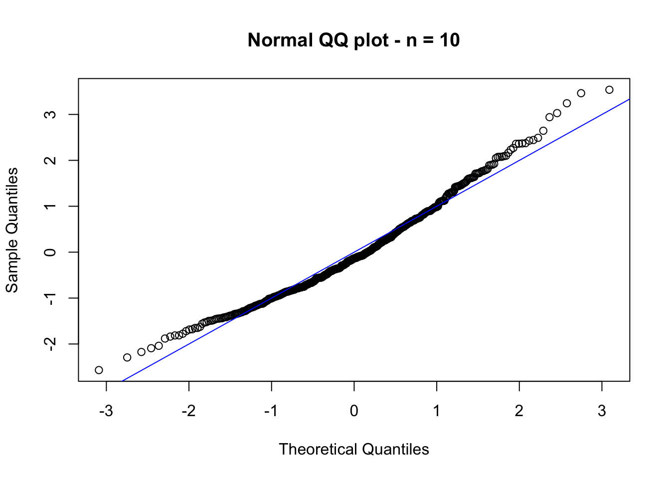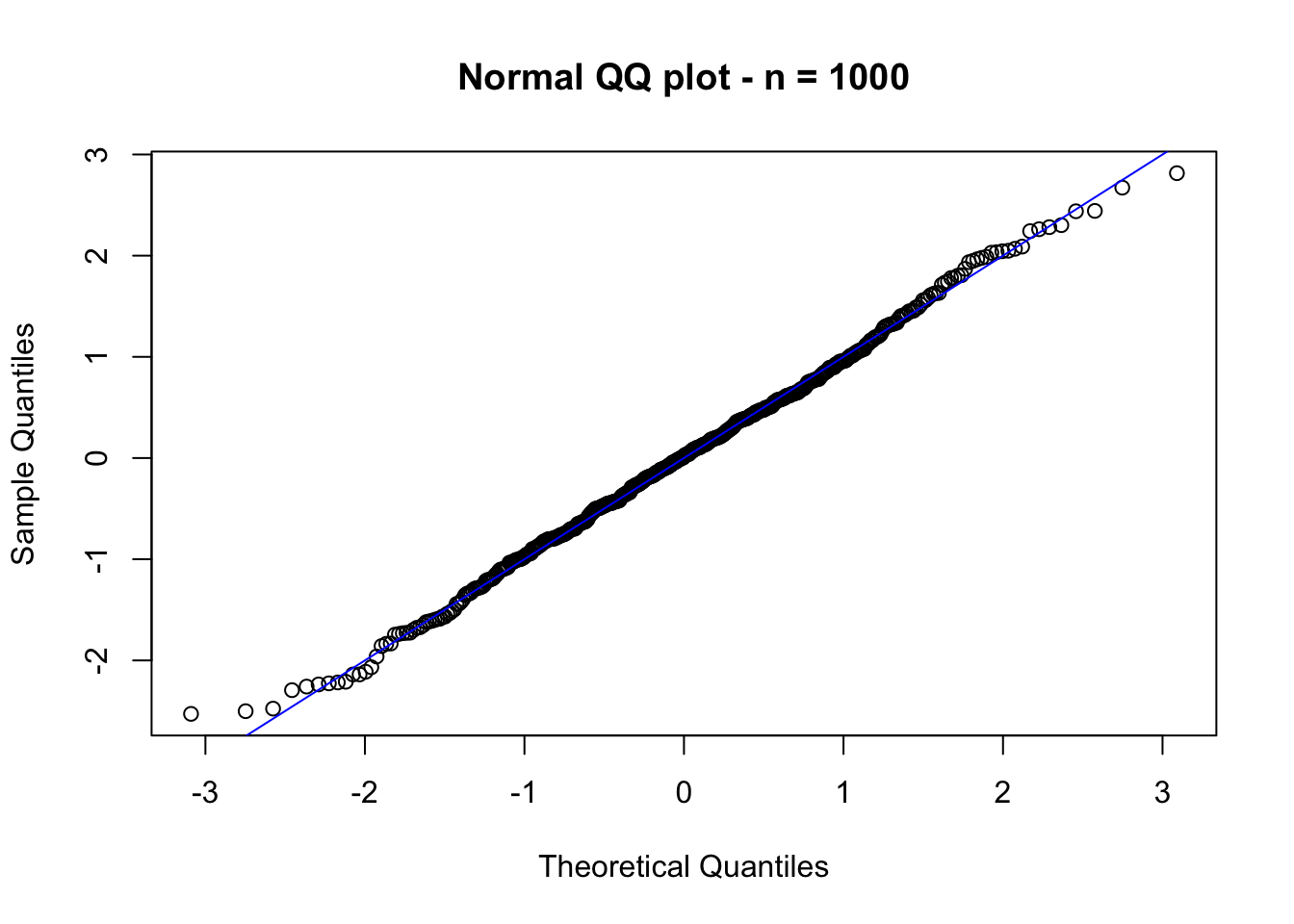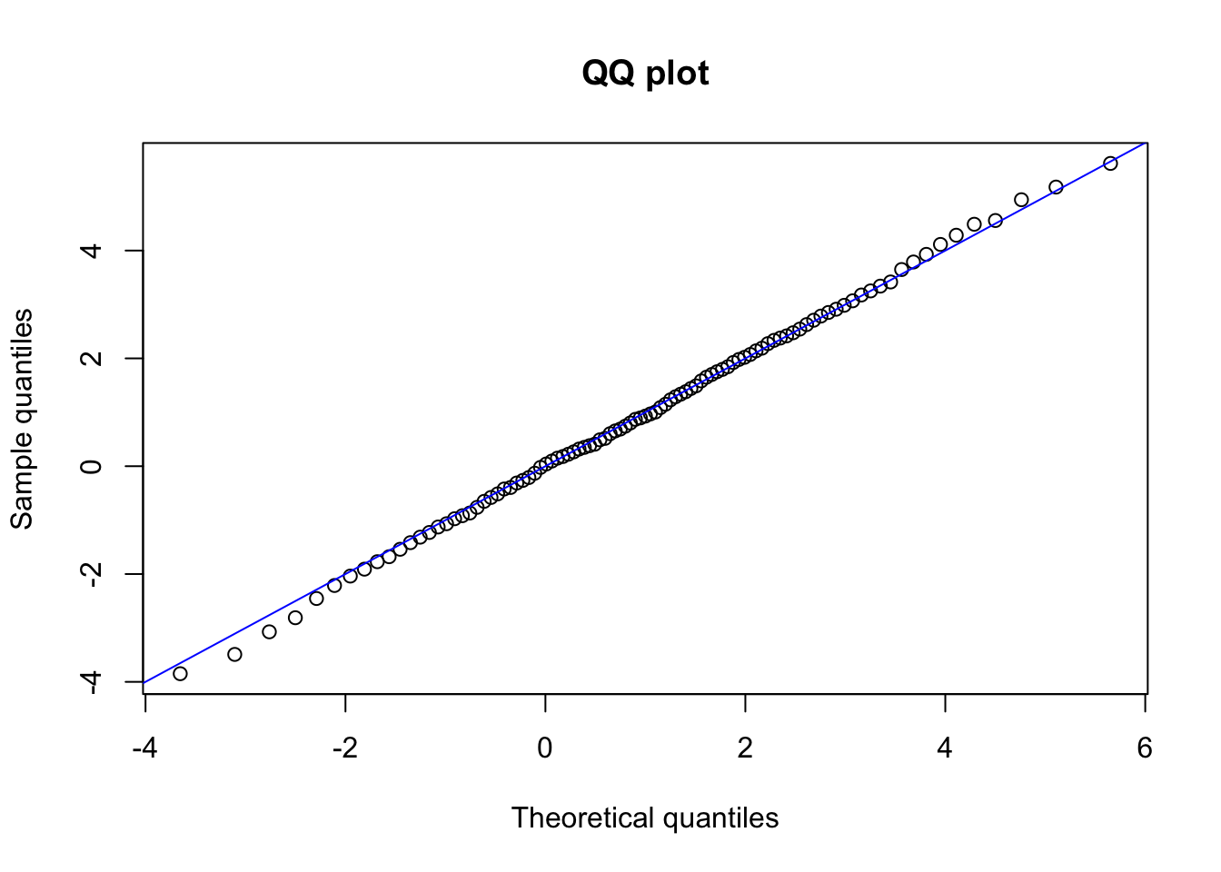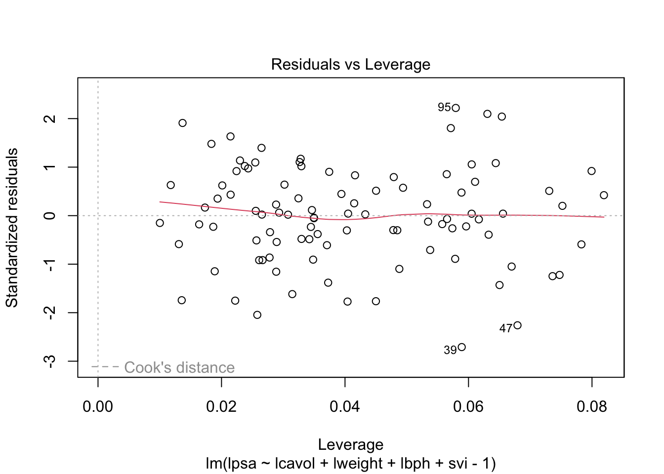 The first plot (Residuals vs Fitted) helps us to assess the condition of mean zero of the residuals. Ideally, we should observe approximately a straight line around 0 (as above). The second plot (Normal Q-Q) deals with the normality of the residuals, and we should preferably observe points close to the identity line. The third plot (Scale-Location) assists us in identifying if the assumption of constant variance holds. We look for a red line close to a horizontal line (no matter the location). Finally, the fourth plot (Residuals vs Leverage) helps us to identify data points that are “extreme” and affect considerable the regression model. This is the case (not observed in the example above) when having points outside the dotted red lines. An in-depth analysis of those points should take place in such a situation.