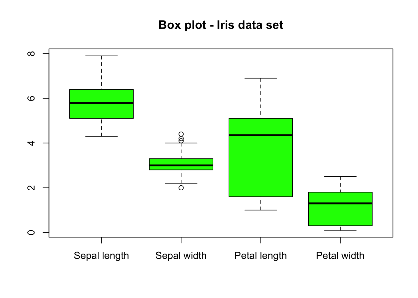 To produce box plots, R uses the boxplot() function. Let us try an example with the iris data set: